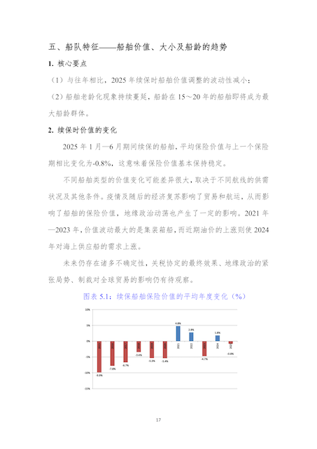 为助力行业精准把握船舶保险市场动态,提升风险应对能力,协会近日完成北欧船舶保险协会Cefor2025年中期船舶保险报告的翻译工作,现分期发布供行业同仁学习参考,本期为最后一期,聚焦第五章“船队特征——船舶价值、大小及船龄的趋势”主题。