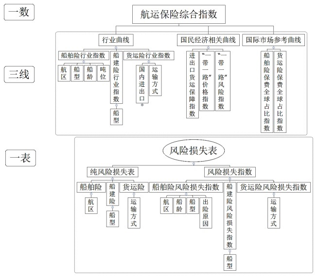 上海航运保险指数,是综合反映中国航运保险业经营情况和风险状况的多层次指数体系,由“一数、三线、一表”构成。 “一数”是指航运保险综合指数,即航运保险综合费率与纯风险损失率差值的季度移动平均时间序列,通过几何加权平均方法综合了船舶险、货运险和船建险等业务。该指数可以整体反映航运保险单位保额的经济增加值变化趋势。 “三线”是指行业曲线、国际市场参照曲线及国民经济参照曲线。其中行业曲线区分船舶险、货运险和船建险,反映单一险类及其细分领域的价格变化趋势。船舶险按照航区、船型、船龄、吨位进行细分,货运险按照国内、进出口、海陆联运运输方式进行细分。国际市场参照曲线主要反映国内、国际两个市场航运保险规模的比较关系。国民经济参照曲线主要反映航运保险服务实体经济提供风险保障的贡献,分为进出口覆盖比例和“一带一路”支持力度两个方面。 “一表”是指风险损失表,具体由纯风险损失表和风险损失指数两个部分组成,通过航运保险主要险种的保额、保费、赔款等数据综合反映行业纯风险损失率情况。风险损失指数按照赔付率随时间推移的情况产生,其中船舶险根据航区、船型、船龄、出险原因进行细分,货运险根据运输方式进行细分。